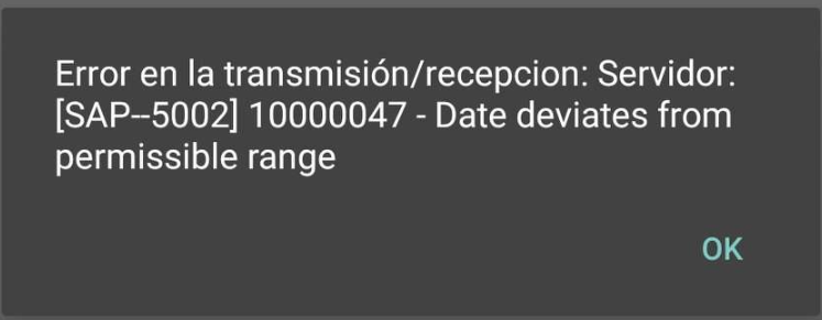 3.- Error en la transmision/recepcion: Servidor: [SAP--5002] 10000047 - Date deviates from permissible range.